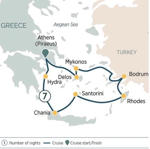 9 DAYS • 20 MEALS Your Greek and Turkish cruise commences and concludes in Athens, a city harmonizing ancient history and contemporary lifestyle. Along the way, discover the mythological allure of Delos and Mykonos. See the Cave of the Apocalypse in Hydra, Chania, Rhodes, and ancient city of Bodrum, Turkey. Enjoy stunning beaches and vibrant markets in colorful Santorini and wander the quaint cobblestone streets of Paros.