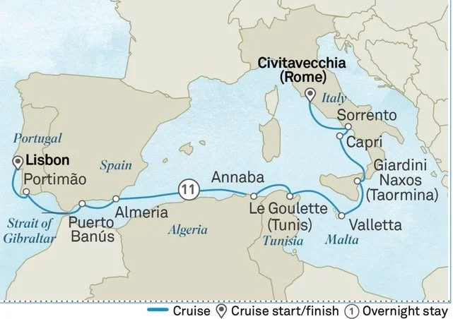 16 DAYS • 42 MEALS Sail through the heart of the Mediterranean on a journey that blends ancient history, cultural treasures, and breathtaking coastal landscapes. This voyage takes you through Italy’s most glamorous coastal towns, the storied islands of Malta and Sicily, and the historic ports of North Africa before arriving at Spain’s sun-drenched shores.